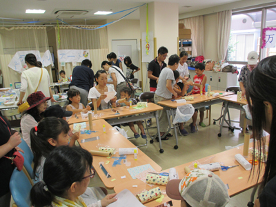 初めての試みでしたのでどのくらいの方々にご参加頂けるか心配しておりましたが、当日は子供を中心に300人余りの方々にお越し頂き、パステルシャインアートと万華鏡作りの教室では、開始と同時に行列ができ、急遽整理券を作ってお配りするということになり嬉しい悲鳴があがりました。お帰りには、万華鏡やパステル画の額を大事に抱えながら「お母さん、楽しかったね」とお話しされる小さなお嬢さんのお声も聴くことができ、職員達もほっと胸を撫で下ろすことができました。来年も開催したいと思いますのでどうぞよろしくお願いいたします。