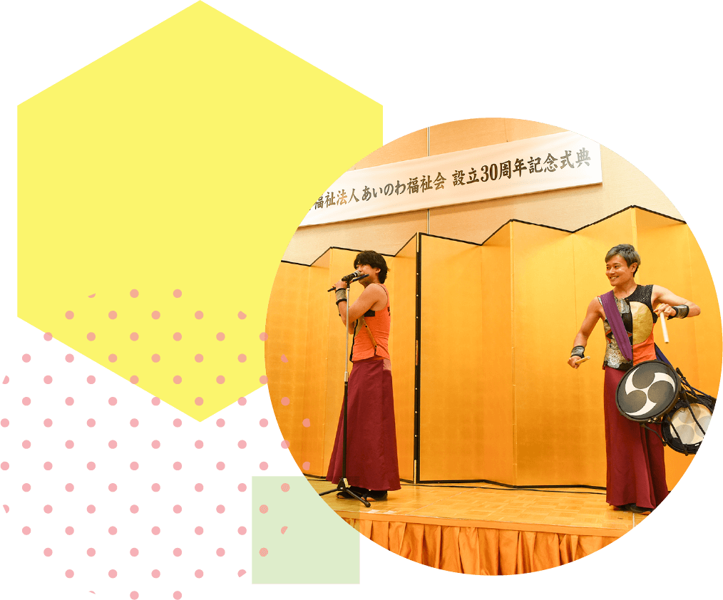 記念式典では法人イメージキャラクターのあいちゃん、のわくんと巡る法人紹介動画、法人設立30周年記念パネルの作成動画の2本の動画を上映しました。また、和太鼓グループ彩-sai-様の和太鼓演奏では電子和太鼓と篠笛の特別編成の演奏で会場が一体となって盛り上がることができました。