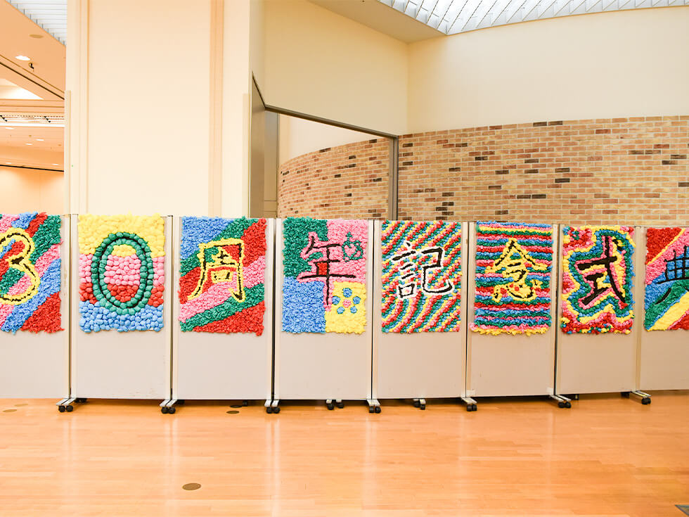 式典では各施設にて「30周年記念式典」を一文字ずつ分担し、ご利用者がお花紙の形や模様を考えて装飾したパネルの作成動画の上映と記念パネルのお披露目を行いました。作成動画ではご利用者が一生懸命、協力しながら作成している様子も映し出され、想いのこもった色鮮やかで素敵な記念パネルが完成しました。