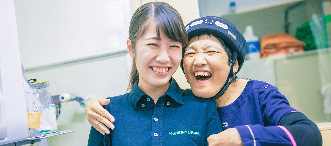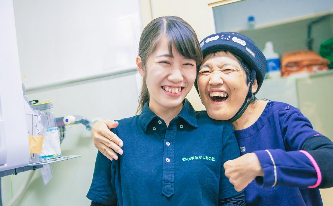 福祉業界は、ベッドの移乗や入浴支援など、体力を使う大変な仕事と思われることも多いですが、あいのわ福祉会では機器や設備の導入を進めており、私の勤める「竹の塚あかしあの杜」でも、エレベーターやリフトなどの機器が揃っているので、私は体力的に辛いと感じたことはありません。