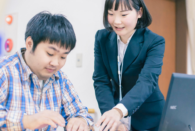 就労移行支援員として2年目、昨年から就労定着支援事業に関わる業務も兼任しています。小さい頃から福祉関係の仕事に憧れていて、学生時代に「神明障がい福祉施設」で社会福祉実習を経験させていただきました